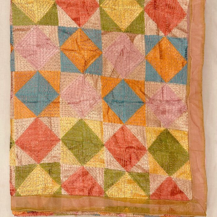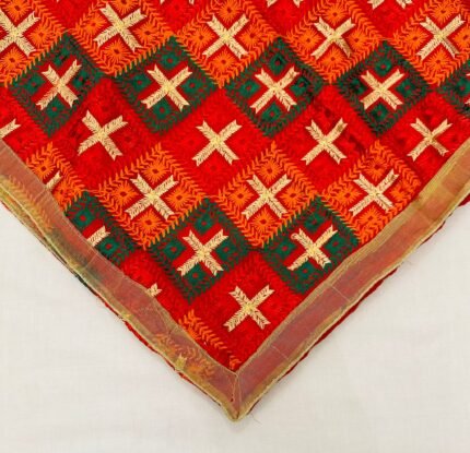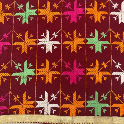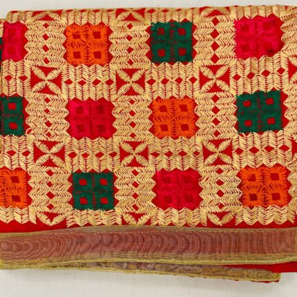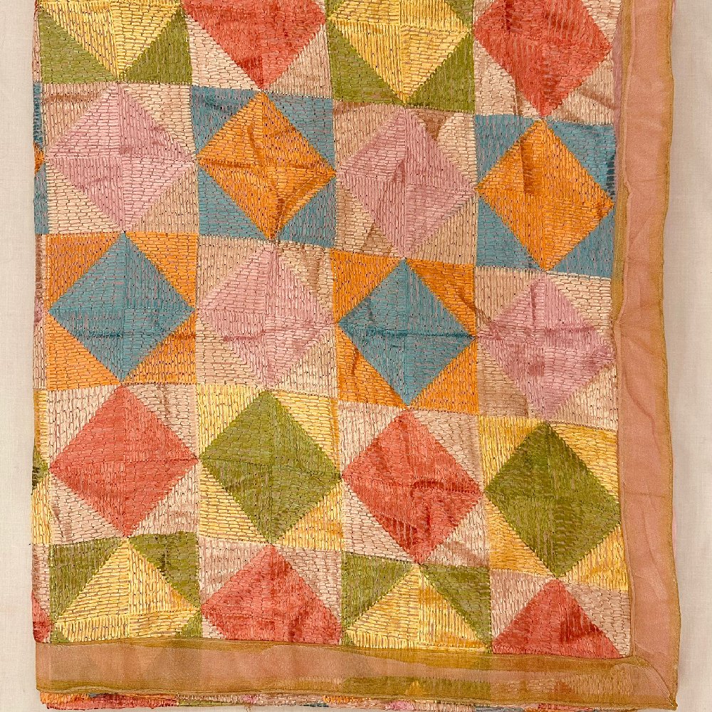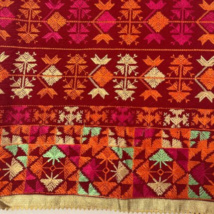 Pattern-embroidered or phulkari embroidery.It is an embroidery technique originally from Punjab in India. Phulkari means flowers work, especially worn during marriages and parties functions etc Hand embroidered Work On heavy dupata, in medium weight size approx 1.2x 2 meters