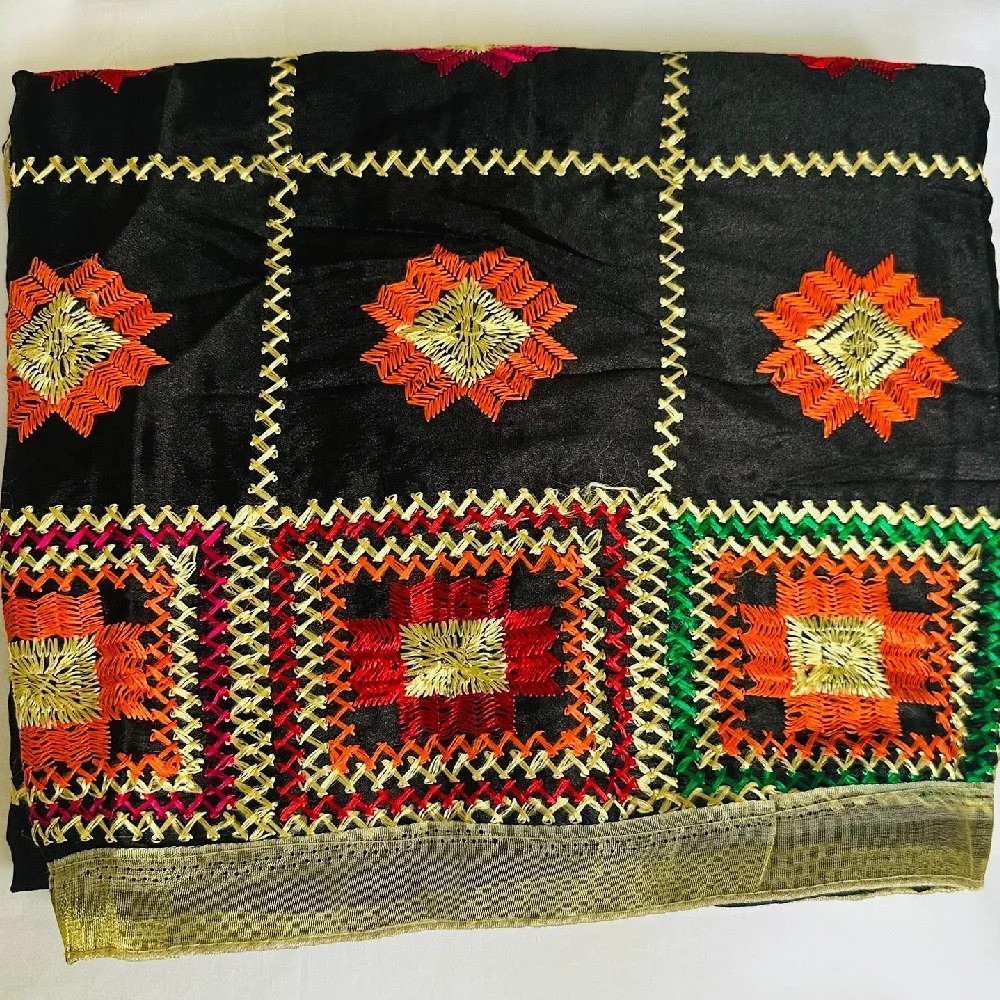 Phulkari duppata Pattern-embroidered or phulkari embroidery.It is an embroidery technique originally from Punjab in India. Phulkari means flowers work, especially worn during marriages and parties functions etc Hand embroidered Work On silk dupatta , medium weight in size approx 1 x 2 meters