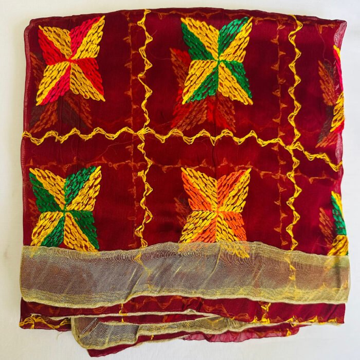 Be the first to review “Chiffon jeorgtte duppata with reshami thread work Phulkari” Cancel reply