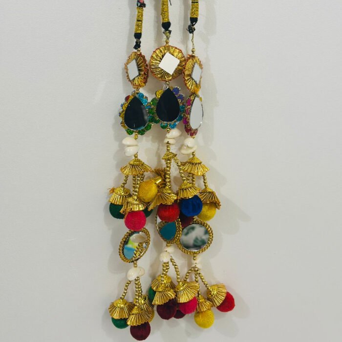 Be the first to review “Design 17 Gold And Multi Colour Punjabi Paranda Hair Accessory With Kaudi and Mirror Parandi Black and Floral Seem Braid Tassels Hair Extensions For Womens” Cancel reply