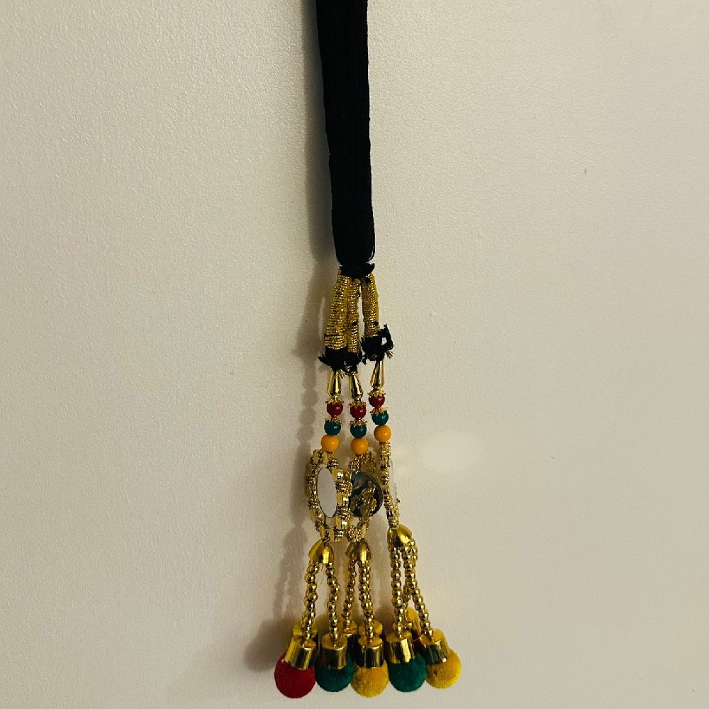 Be the first to review “Design 5 Gold And Multi Colour Punjabi Paranda Hair Accessory With Mirror Tassels Black Braids Hair Extensions For Womens” Cancel reply