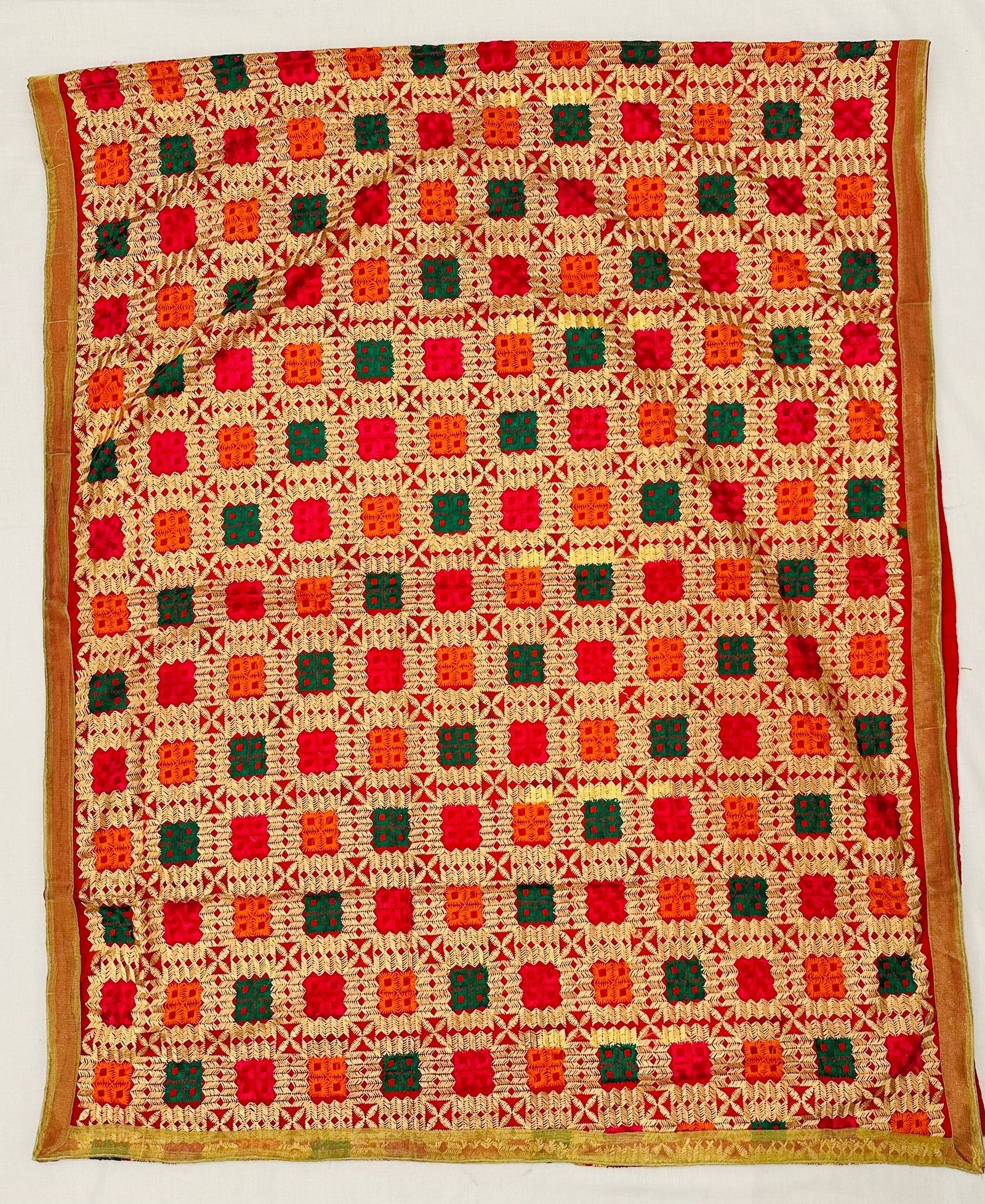 Pattern-embroidered or phulkari embroidery.It is an embroidery technique originally from Punjab in India. Phulkari means flowers work, especially worn during marriages and parties functions etc Hand embroidered Work On heavy dupatta , medium weight in size approx 1.2 x 2 meters