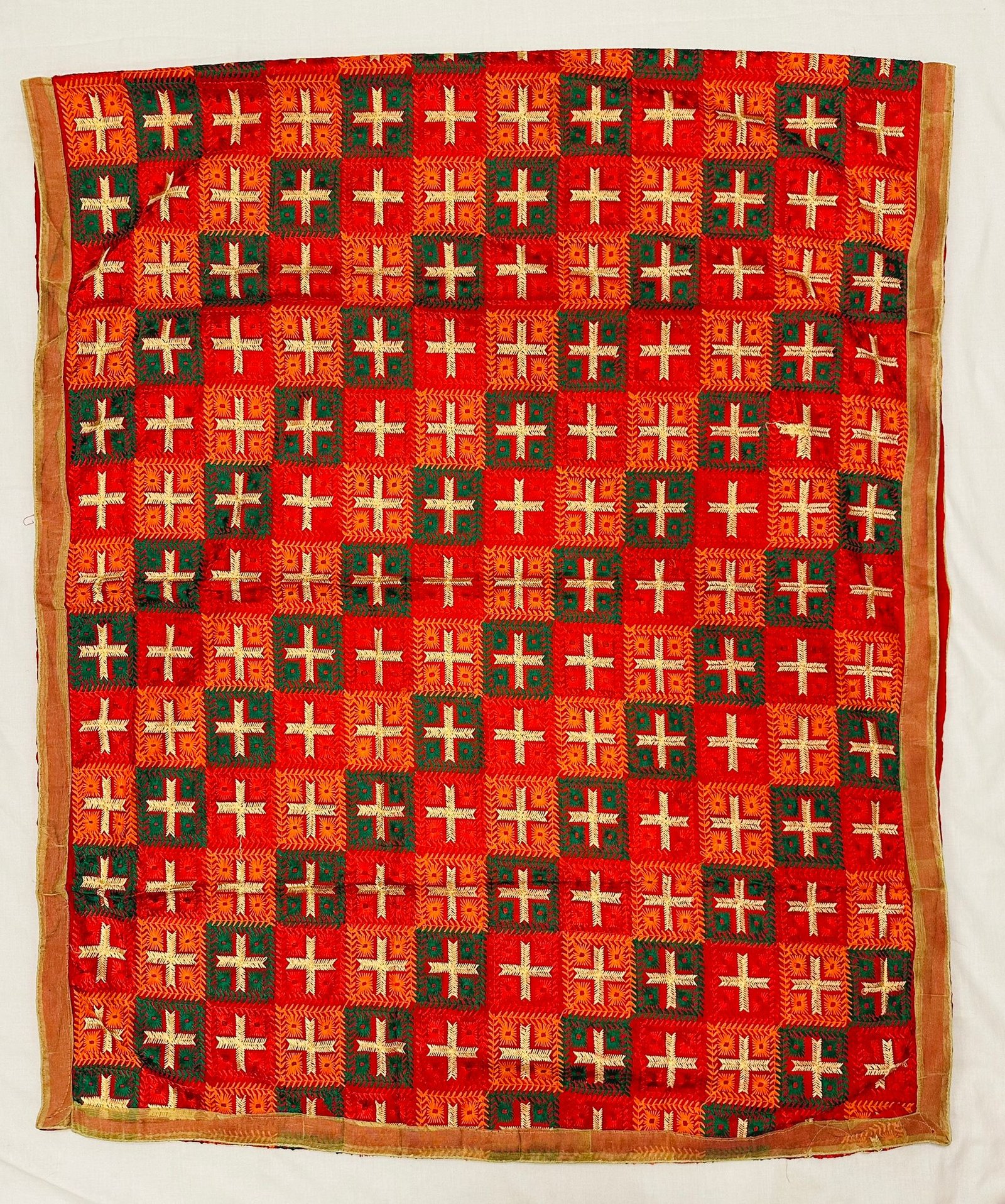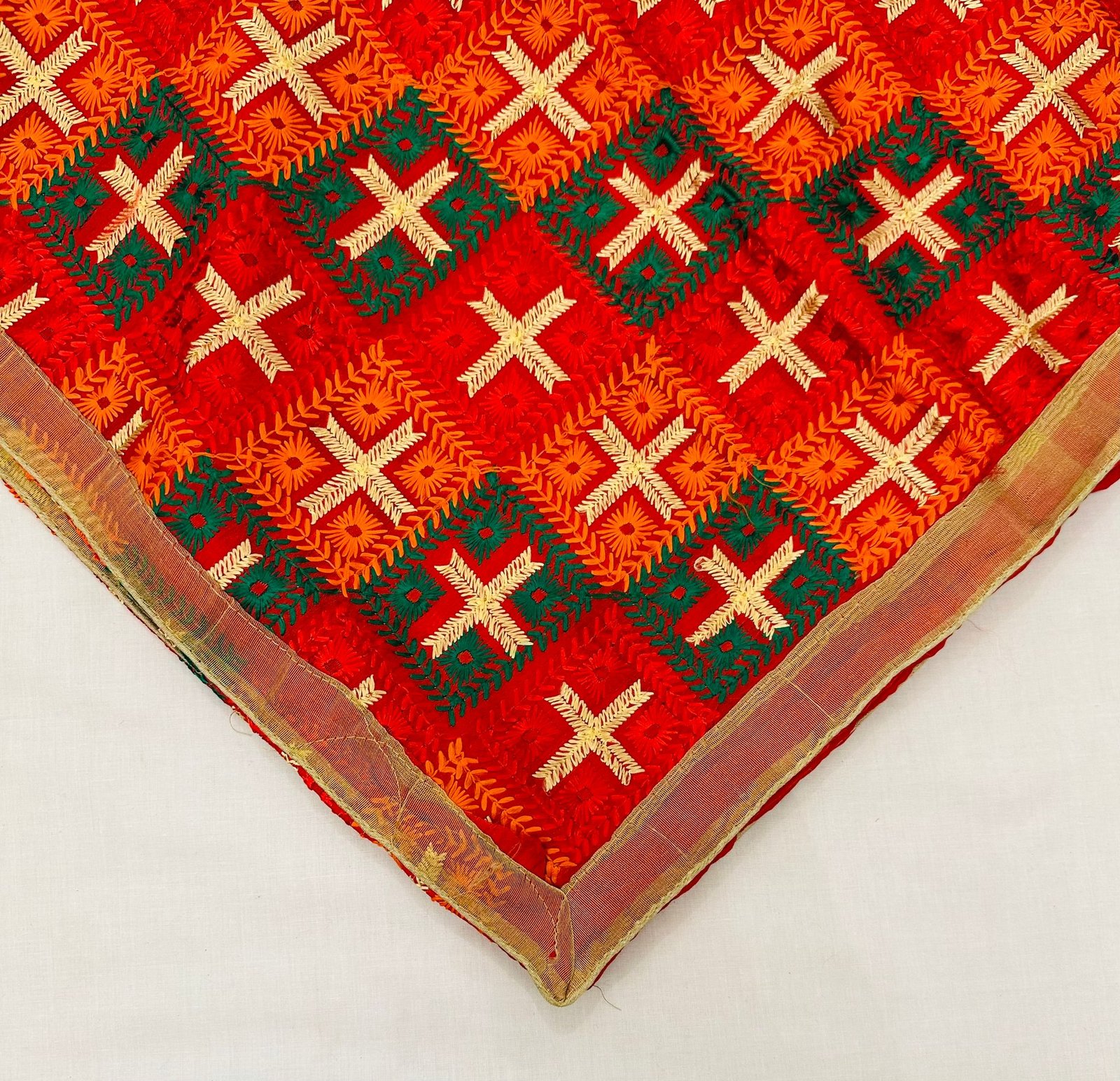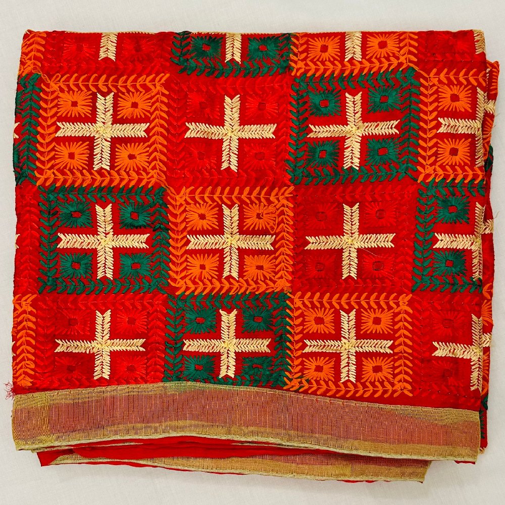 Pattern-embroidered or phulkari embroidery.It is an embroidery technique originally from Punjab in India. Phulkari means flowers work, especially worn during marriages and parties functions etc Hand embroidered Work On heavy dupatta , medium weight in size approx 1.2 x 2 meters