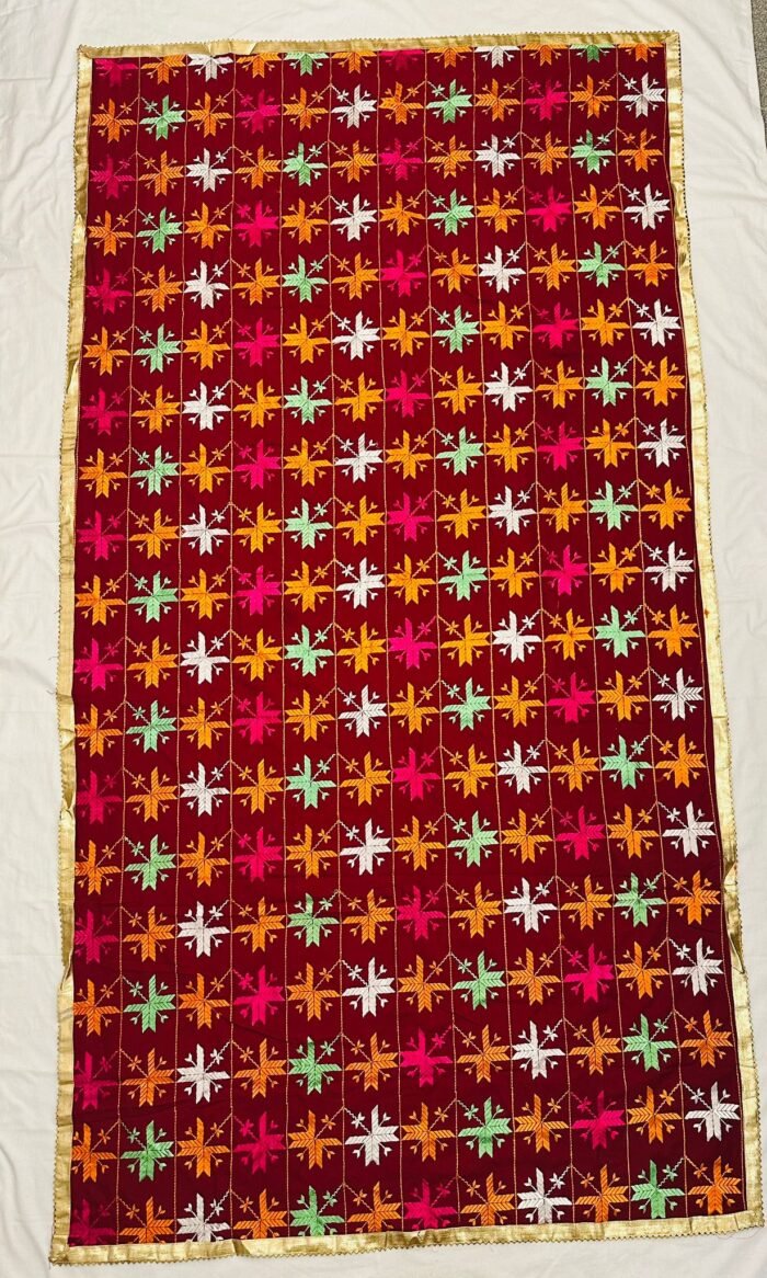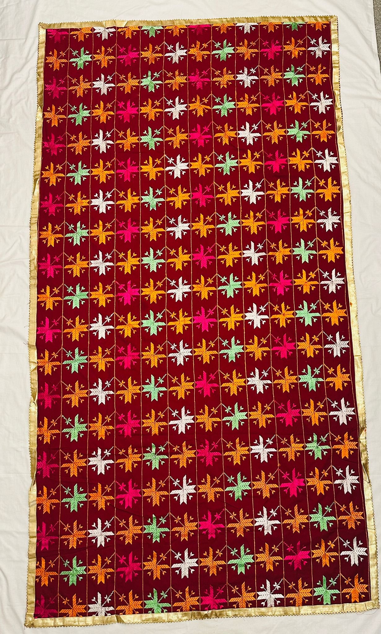 Pattern-embroidered or phulkari embroidery.It is an embroidery technique originally from Punjab in India. Phulkari means flowers work, especially worn during marriages and parties functions etc Hand embroidered Work On khadar cotton , heavy weight in size approx 1.25 x 2.5 meters.