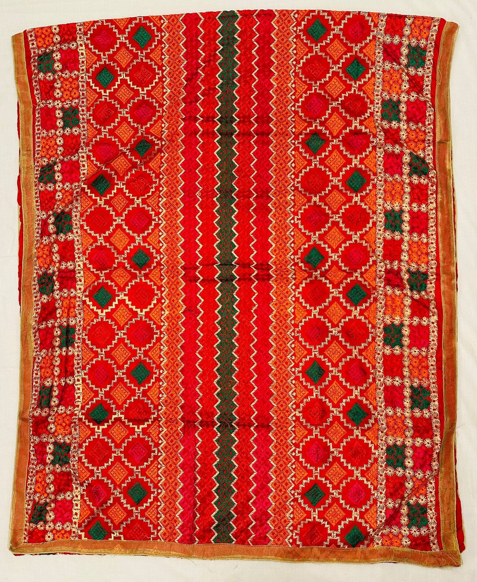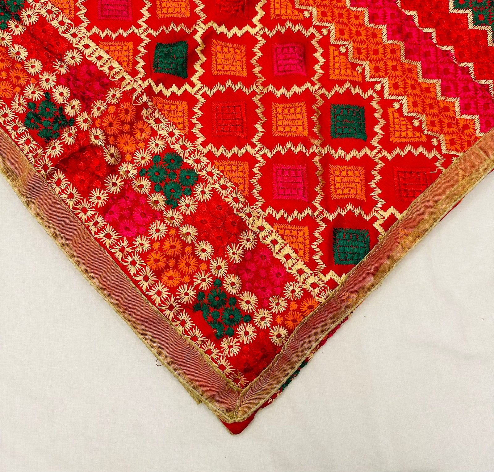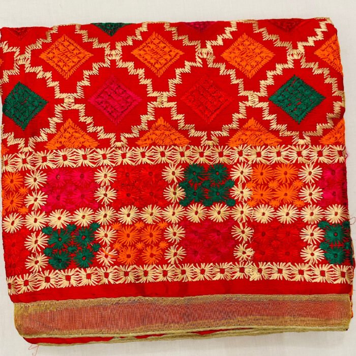 Pattern-embroidered or phulkari embroidery.It is an embroidery technique originally from Punjab in India. Phulkari means flowers work, especially worn during marriages and parties functions etc Hand embroidered Work On heavy dupatta , medium weight in size approx 1.2 x 2 meters