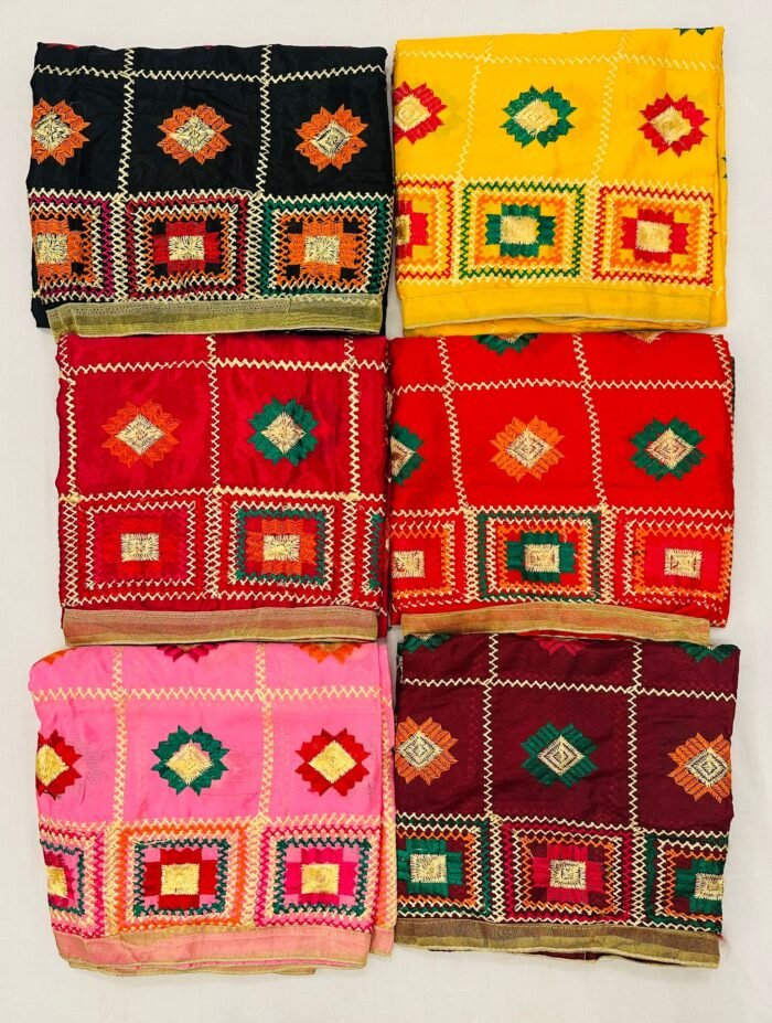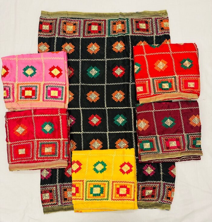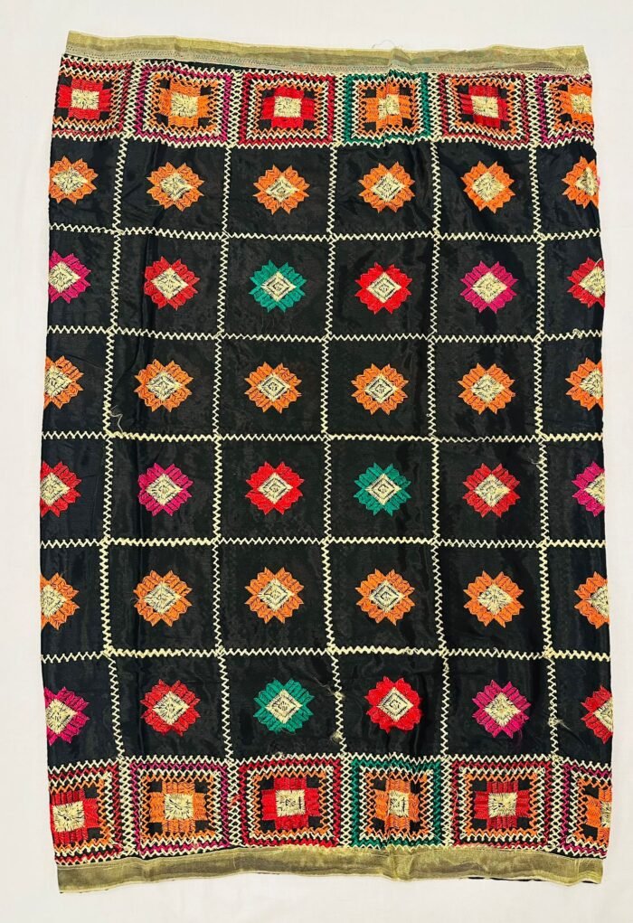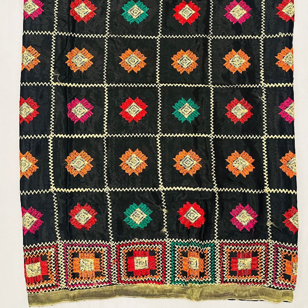 Phulkari duppata Pattern-embroidered or phulkari embroidery.It is an embroidery technique originally from Punjab in India. Phulkari means flowers work, especially worn during marriages and parties functions etc Hand embroidered Work On silk dupatta , medium weight in size approx 1 x 2 meters
